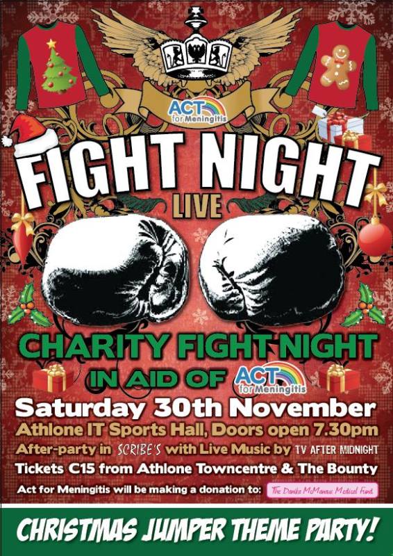 ACT for Meningitis is a non -profit organisation based in Galway, Ireland. It was established in 2011 by Siobhán and Noel Carroll, who in 2008 lost their precious daughter Aoibhe – aged 4- to Meningitis. Since losing Aoibhe, Siobhán and Noel feel that there is an urgent need to increase awareness and educate people of the signs and symptoms of Meningitis. To help raise funds for this amazing charity, they are holding their very own fight night on Saturday 30th of November at 7.30pm on in the Sports Hall in Athlone IT. Tickets are €15 and can be purchased at Athlone Town Centre and The Bounty. Please support by getting your ticket today.