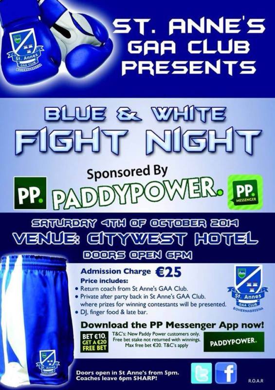 Blue and White Fight Night 4/1/14 September 19, 2014June 16, 2017 by c og St Annes Gaa Tallaght and whitecollarboxing.ie proudly present Blue and White Fight Night in Citywest Hotel. The show is sponsored by Paddy Power and tickets are €25. The training is going well and there is over 1000 tickets sold already