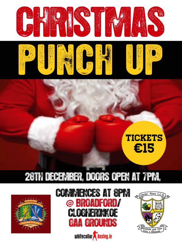 Christmas Punch Up - 28 December 2013 March 7, 2013June 16, 2017 by c og The festive season has turned fight season as Broadford take on Clogherinkoe in a Christmas Punch Up like no other! This event is not to be missed - taking place on the 28th December 2013. For tickets please contact clubs or Sarah on 087-6772398