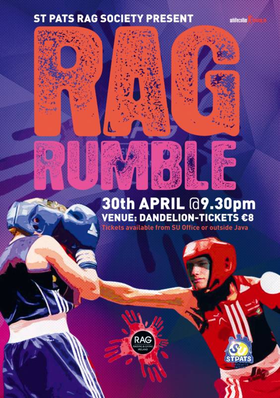 St Patrick’s College in association with whitecollarboxing.ie presents the ‘RAG RUMBLE’ in Dandelion Nightclub at 9.30pm on Wednesday 30th April 2014. Punishment exacted will be like never before – so sit up straight and take notice as this show will be devastating! Who’ll be saved by the bell?? Be there on the night to find out! Tickets are ONLY €8 and can be purchased from the SU Office or outside Java. Note: This is an over 18’s event. I.D. will be required.
